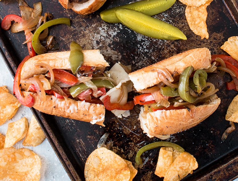 This sausage and pepper hoagie melt is loaded down with sauteed peppers, onions, and melty vegan cheese - on a toasted poppy seed bun. YUM.